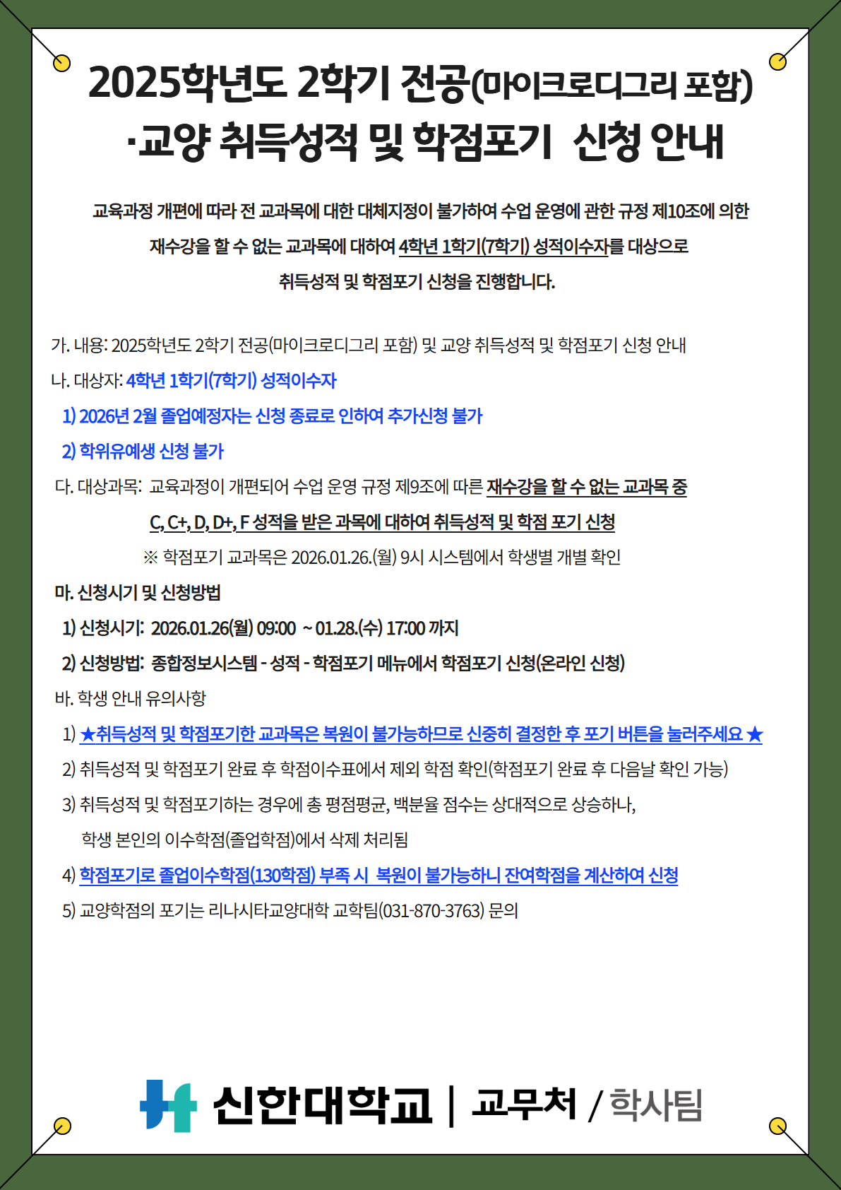 [학사팀/성적] 2025학년도 2학기 전공·교양 취득성적 및 학점포기 신청 안내