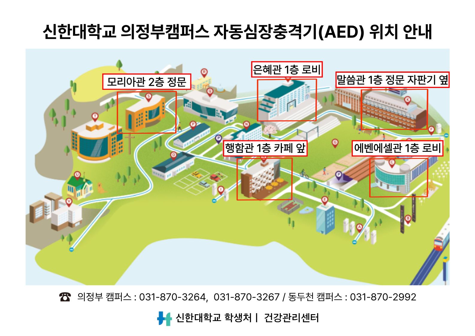 1. 건강관리센터에서는 교내 응급상황에 대비하여 자동심장충격기(AED)를 설치·운영하고 있습니다.