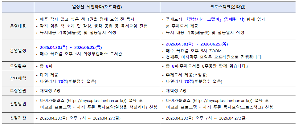 ■ 독서모임 신청은 MYCA+ 에서 신청하시기 바랍니다. https://mycaplus.shinhan.ac.kr/
