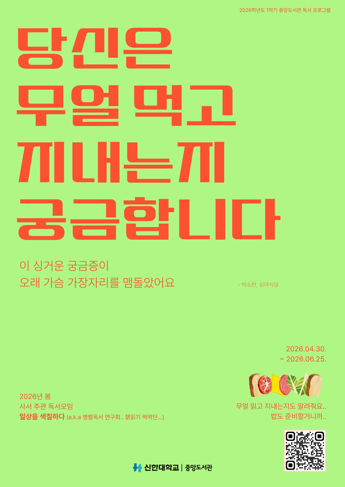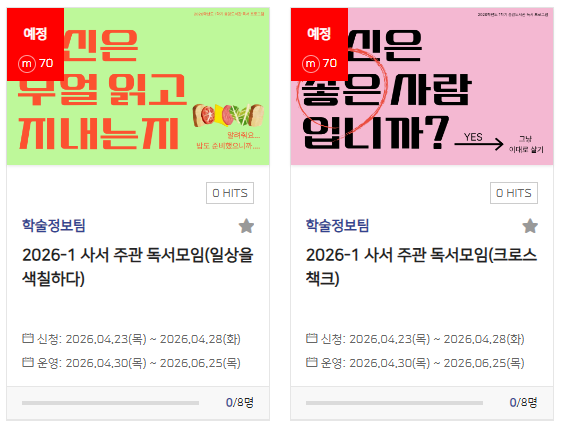 [중앙도서관] 2026학년도 1학기 사서 주관 독서모임 참여자 모집 안내(4/23~4/27)